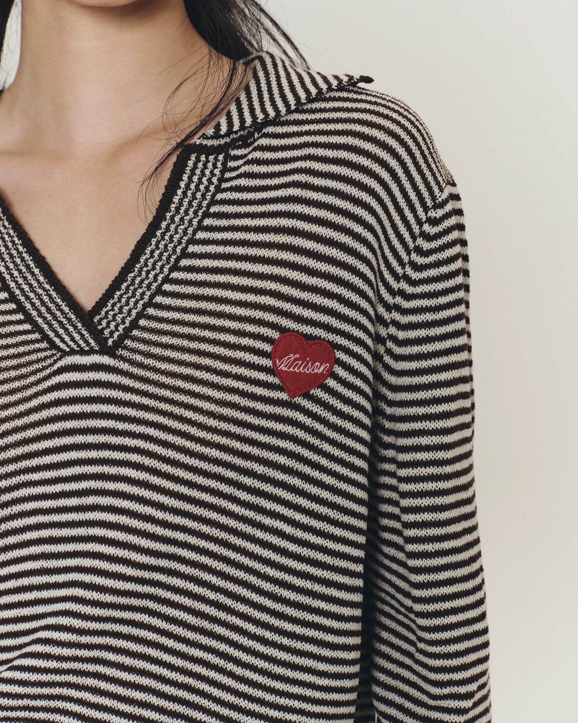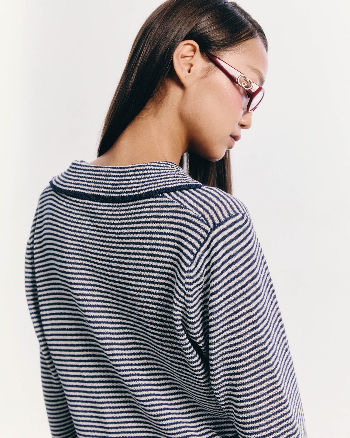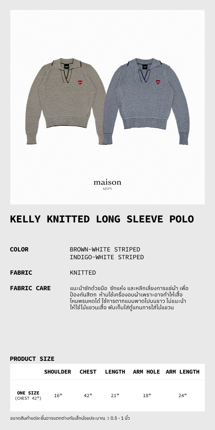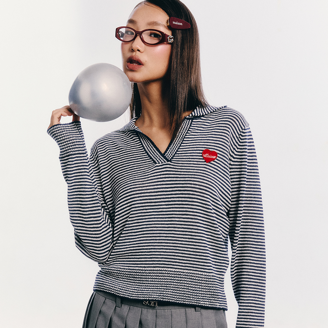 เสื้อไหมพรมโปโลแขนยาวลายทาง ชายเสื้อจั๊มเอวเล็กน้อย ทอด้วยไหมพรมเนื้อนุ่ม บางเบา สบายผิว ออกแบบมาเป็นทรง Loose หลวมๆ แต่งดีเทลน่ารักๆ ด้วยป้าย Patch หัวใจสีแดงปักโลโก้ลายเส้นตัวเขียน maison ที่อกซ้ายเป็นกิมมิค จะใส่ตัวเดียวเดี่ยวๆให้ดูเรียบเท่ หรือแมตช์กับไอเท็มอื่นให้ลุคดูมีมิติ ก็สไตล์ลิ่งได้ไม่มีเบื่อ