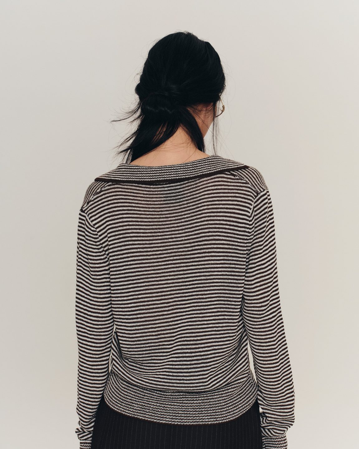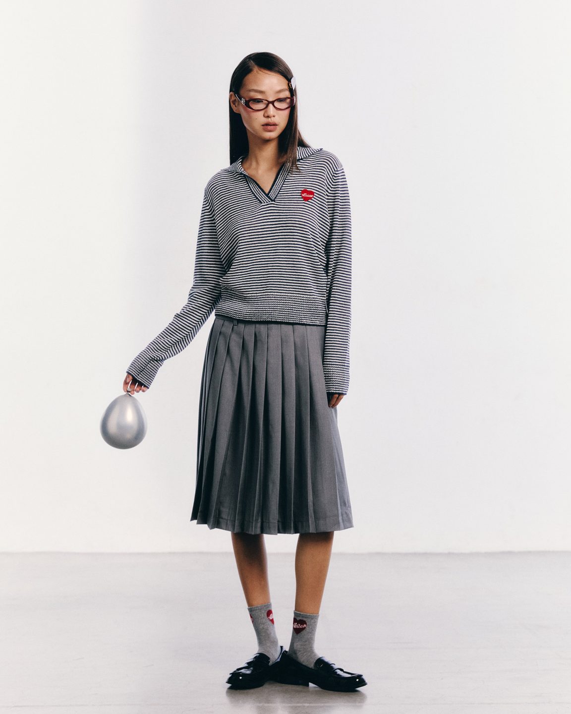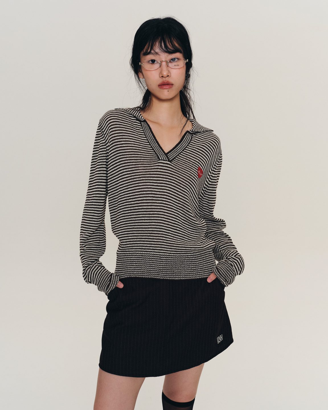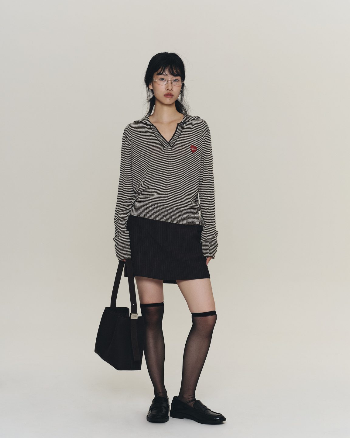 เสื้อไหมพรมโปโลแขนยาวลายทาง ชายเสื้อจั๊มเอวเล็กน้อย ทอด้วยไหมพรมเนื้อนุ่ม บางเบา สบายผิว ออกแบบมาเป็นทรง Loose หลวมๆ แต่งดีเทลน่ารักๆ ด้วยป้าย Patch หัวใจสีแดงปักโลโก้ลายเส้นตัวเขียน maison ที่อกซ้ายเป็นกิมมิค จะใส่ตัวเดียวเดี่ยวๆให้ดูเรียบเท่ หรือแมตช์กับไอเท็มอื่นให้ลุคดูมีมิติ ก็สไตล์ลิ่งได้ไม่มีเบื่อ