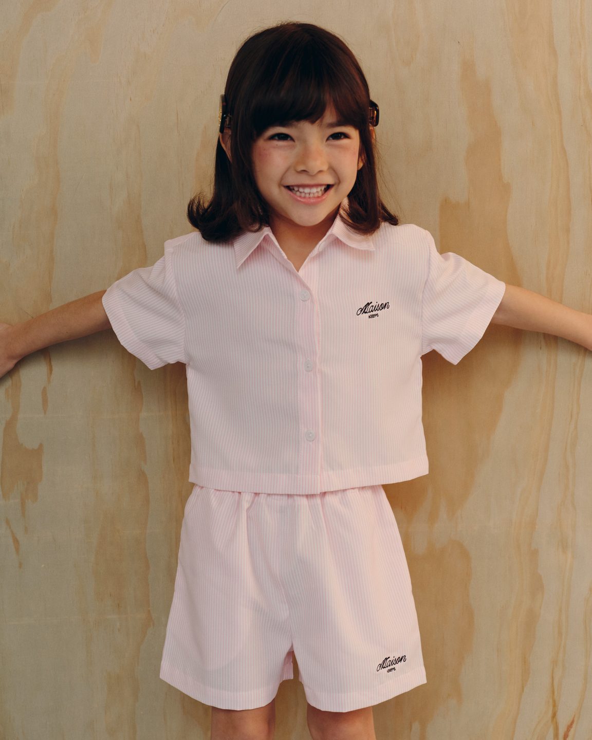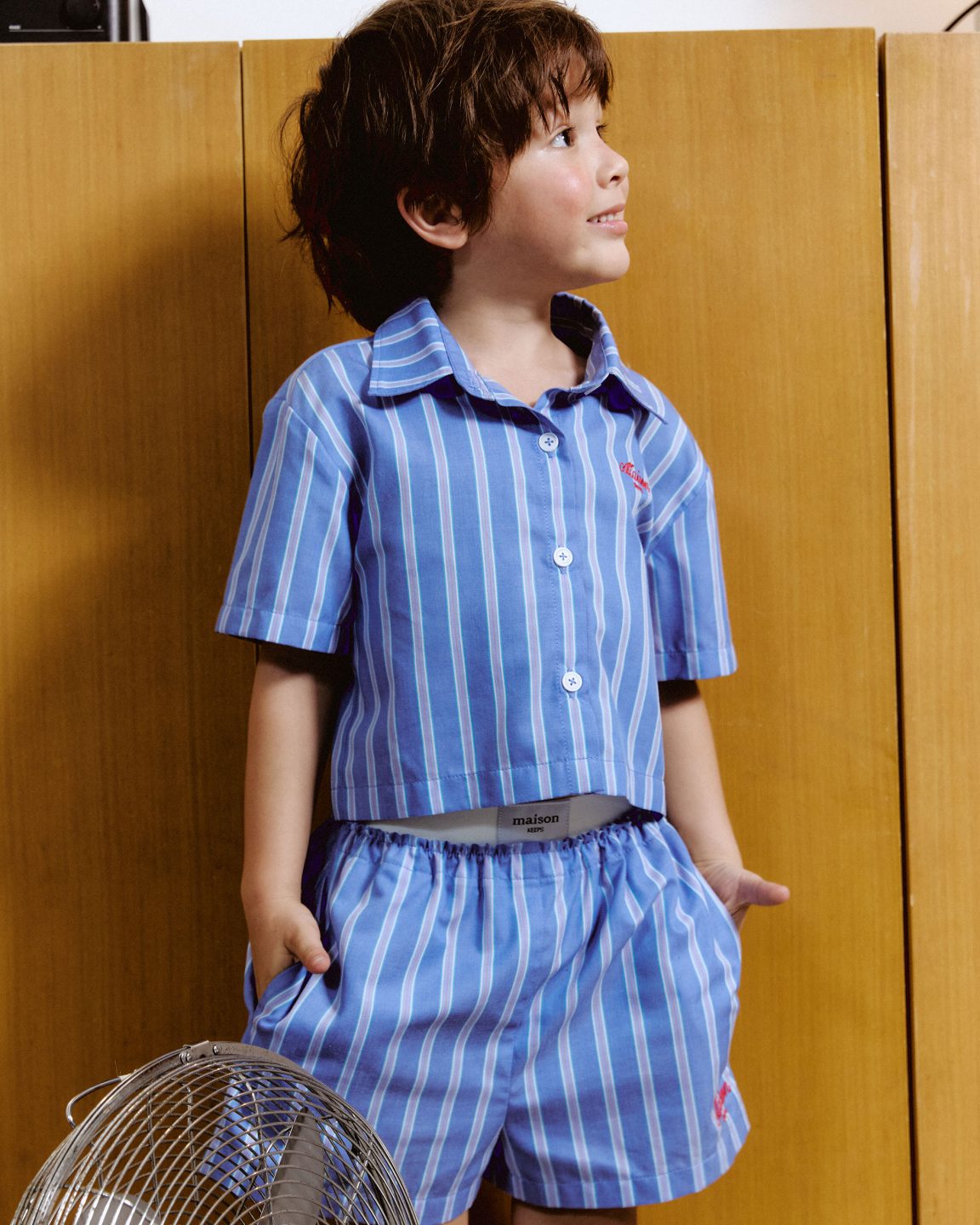 ไอเทมน้องเด็กมาใหม่! กางเกงขาสั้นลายทาง ขอบเอวยางยืด ปักโลโก้ลายเขียน maison KEEPS สีดำตัดกับสีของเนื้อผ้าที่บริเวณริมซ้ายล่างของขอบกางเกง ทางแบรนด์เลือกใช้ยางยืดที่คุณภาพดี ไม่รัดแน่นไปและไม่ย้วยง่าย โดยแต่งด้วยป้ายทอโลโก้ maison KEEPS ในตำแหน่งกึ่งกลางของขอบยางยืด นำไปแมตช์กับเสื้อรุ่น Jeanne Shirt เป็น Total Look แบบ Co-Ord set เข้ากันน่ารักสดใสเหมาะกับเด็ก ๆ หรือจะใส่กับเสื้อยืดก็ให้ลุคสบาย ๆ