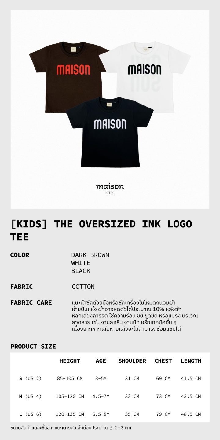 เสื้อยืดสำหรับเด็ก ที่นำรุ่นขายดีอย่าง The Oversized Ink Logo Tee มาย่อส่วนครบทุกองค์ประกอบ เนื้อผ้าสุดนุ่ม เบาสบาย ที่ใส่แล้วไม่บาดผิว ทรงเสื้อสไตล์ oversized แบบหลวมๆที่ตอบโจทย์สำหรับเด็กๆ ที่โตไว ซื้อแบบ oversized พอโตขึ้นน้องๆ ก็ยังใส่ได้อยู่ จัดเต็มด้วยลายสกรีนโลโก้ maison แบบตะโกน ทั้งด้านหน้าและด้านหลัง เป็น Basic Item ที่ควรมีติดตู้ จะนำไป match กับท่อนล่างชิ้นไหนก็เข้าได้กับทุกตัว