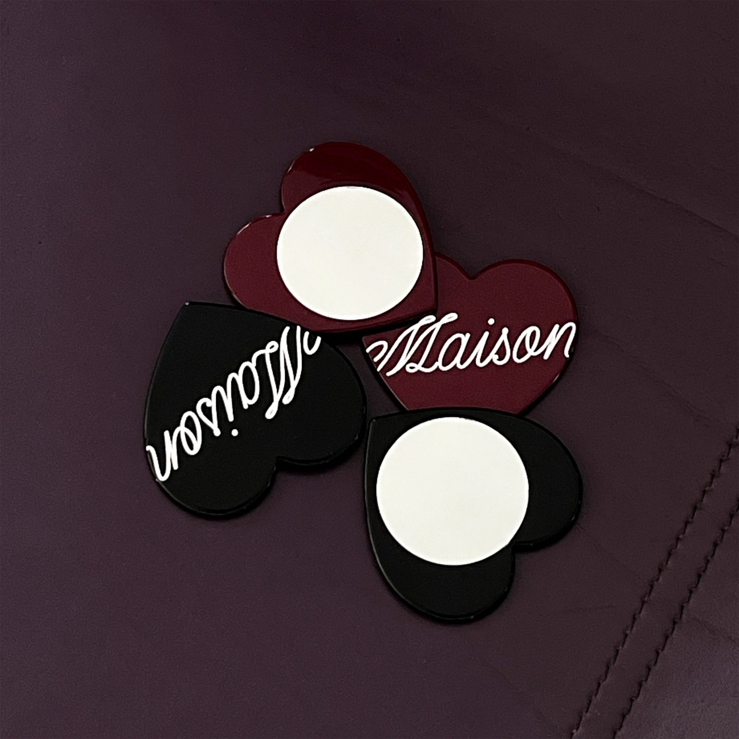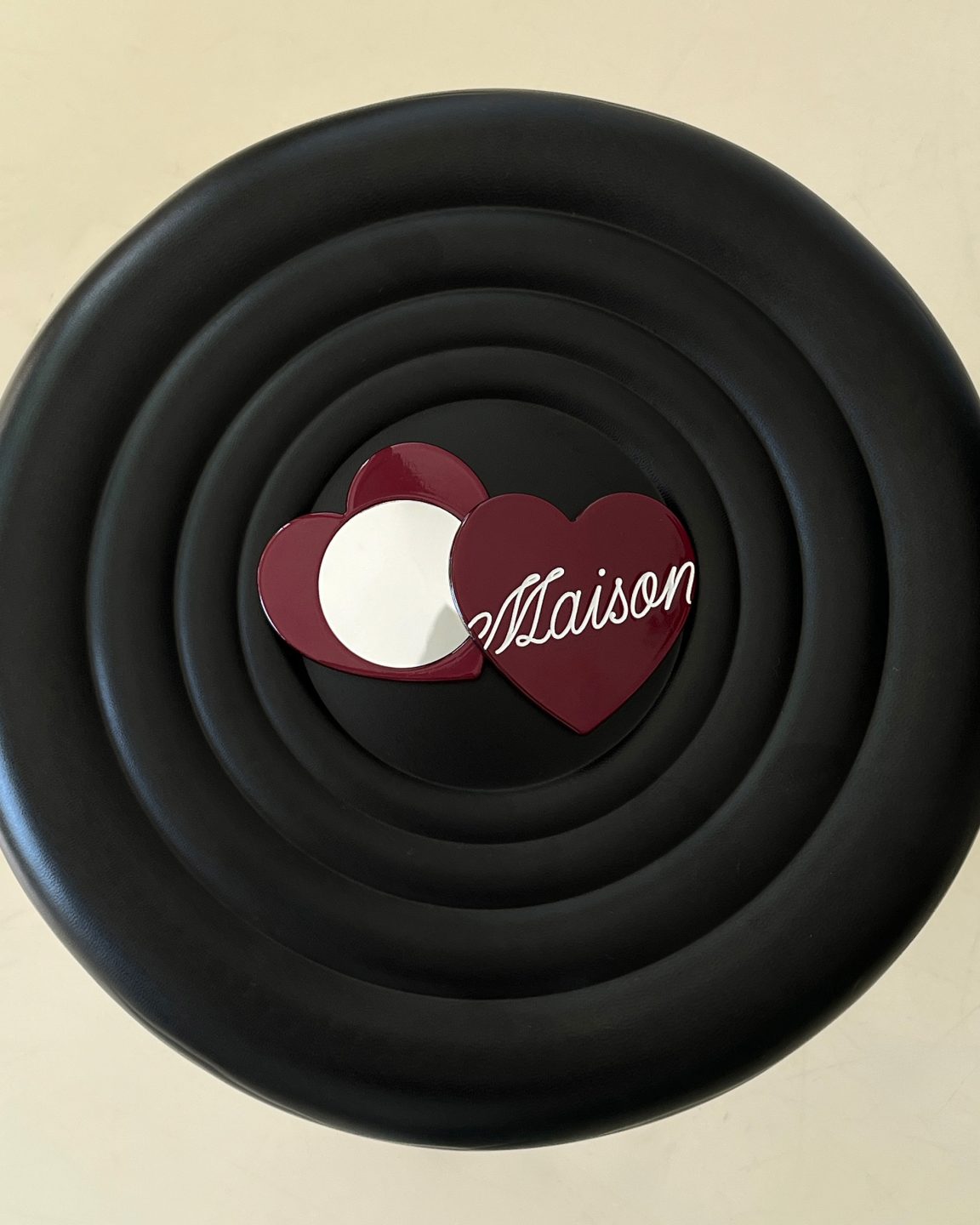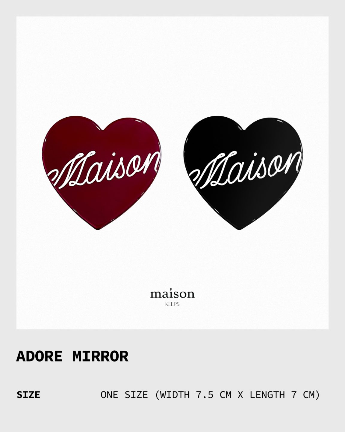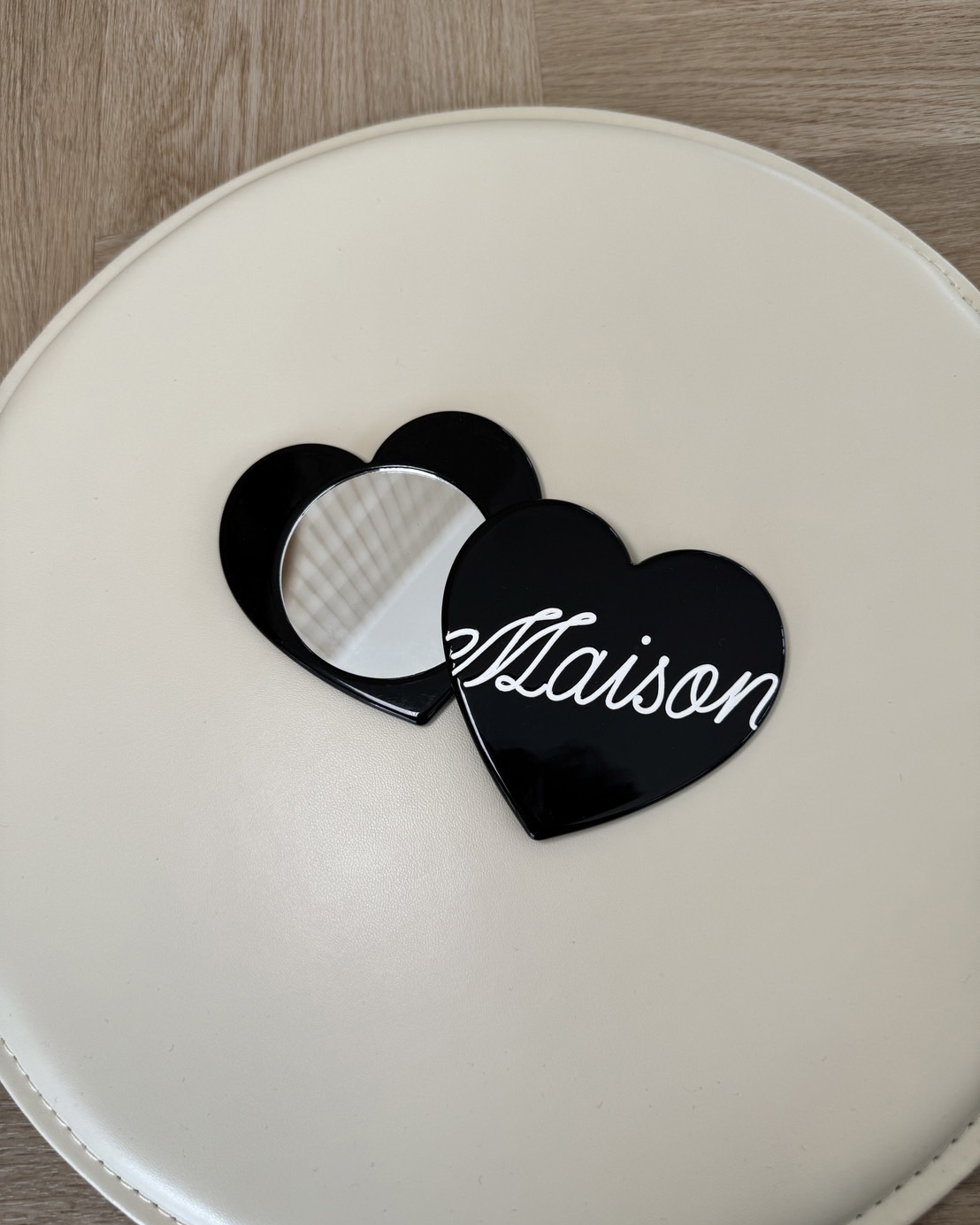 กระจกรูปหัวใจ ปั๊มโลโก้ลายเส้นตัวเขียน maison สีขาว เป็นโลโก้สุดฮิตที่ทุกคนชื่นชอบ ดีไซน์เรียบแต่เก๋ พกพาง่าย ใช้งานได้ทุกวัน เป็นอีกหนึ่งไอเทมที่สาวๆต้องมีติดกระเป๋า! 🪞✨