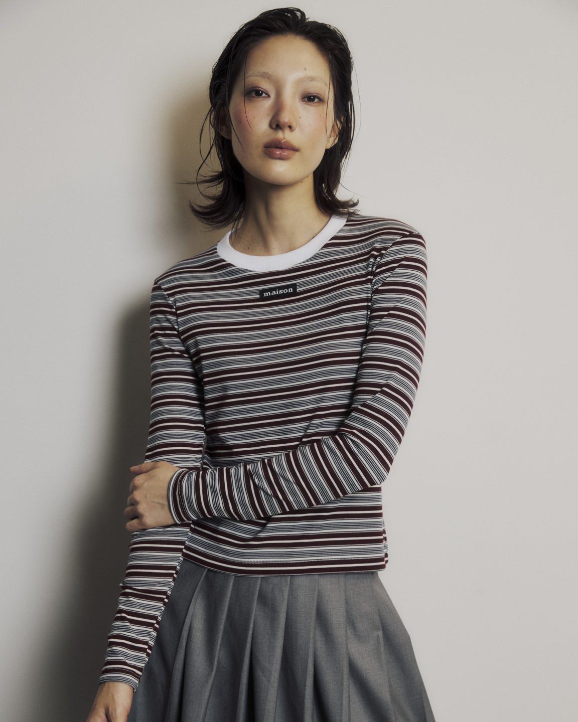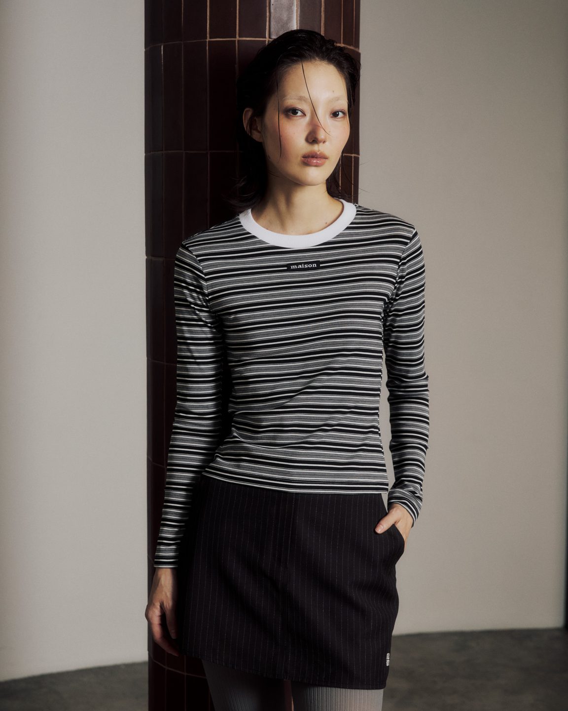 เสื้อแขนยาวสีใหม่ ดีไซน์โดดเด่นด้วยการจับคู่สีของขอบกุ๊นคอตัดกับตัวเสื้อสไตล์วินเทจ เป็นทรง Slim fit ที่เข้ารูปพอดีตัว ใส่แล้วสัดส่วนชัดแต่ไม่รัดจนเกินไป เพิ่มกิมมิคด้วยการติดป้ายทอ maison ตรงกลางอก เลือกใช้เนื้อผ้าลายทางสุดคลาสสิค ที่มีความยืดหยุ่น เนื้อนุ่ม สัมผัสเบาสบาย ไม่ระคายผิว เติมลุคเก๋สไตล์ วินเทจชิคๆได้ในตัวเดียว