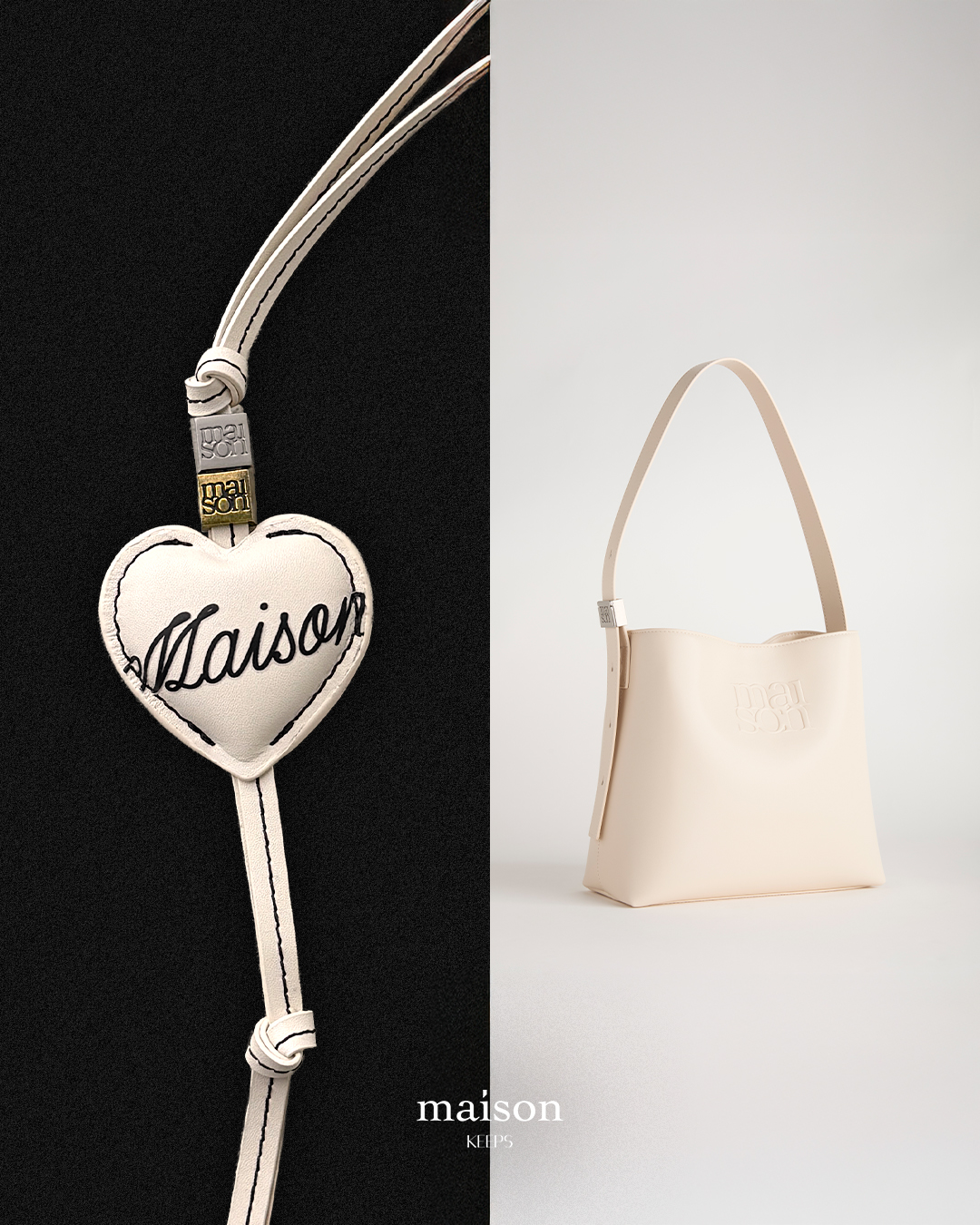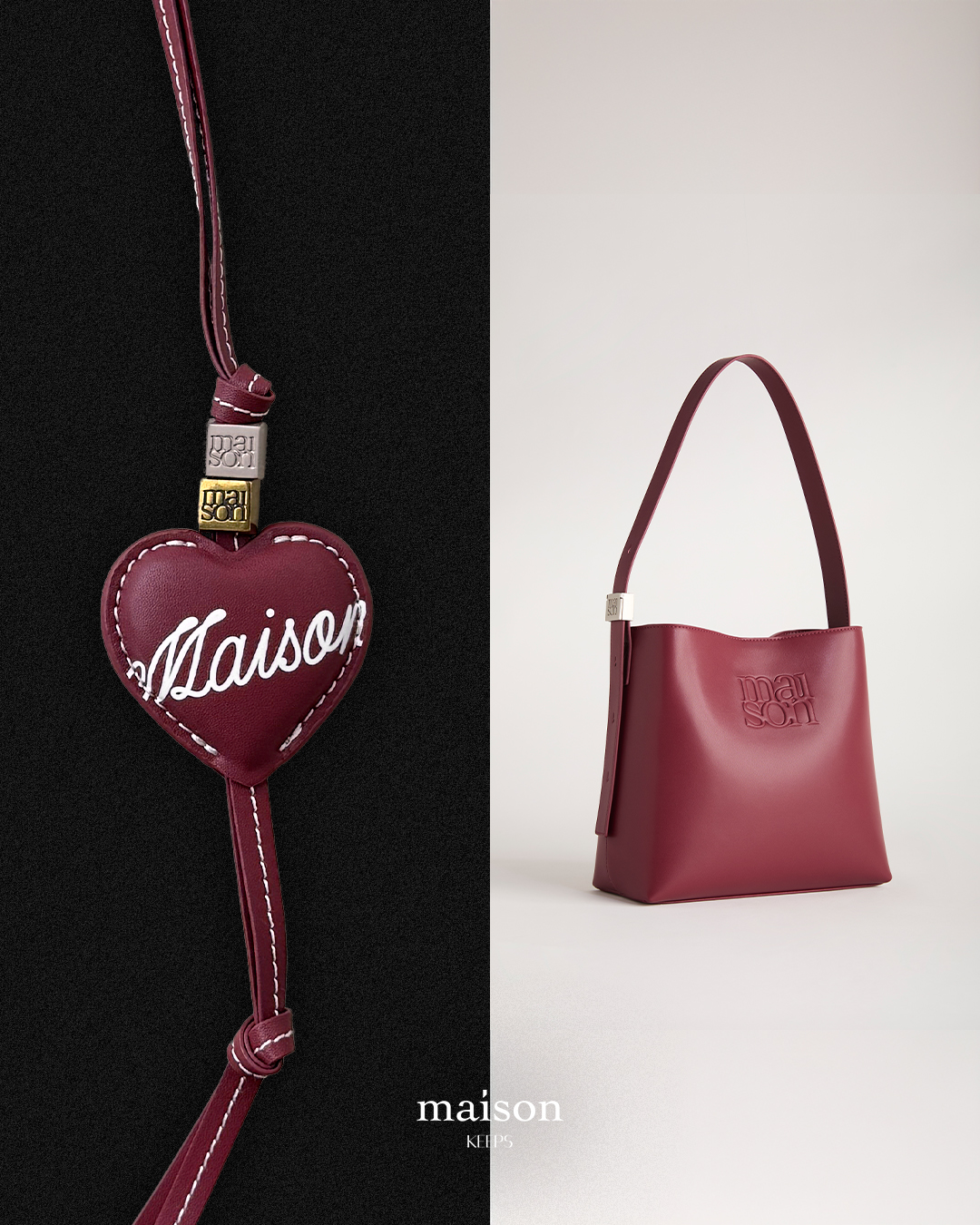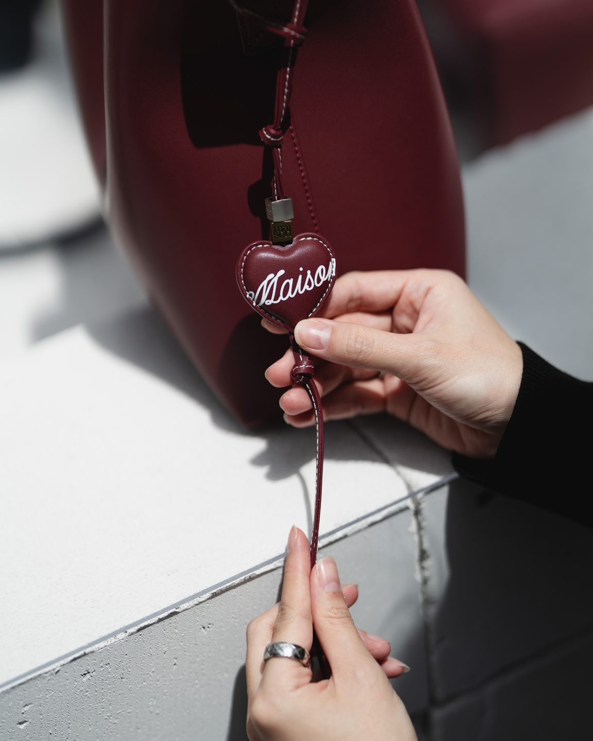 พวงกุญแจรูปหัวใจ ที่ตั้งใจจับคู่สีสกรีนโลโก้ลายเส้นตัวเขียน maison มาให้อย่างลงตัว ผลิตจาก Premium Vegan Leather น้ำหนักเบาและสัมผัสนุ่มฟูแบบ Puffy เพิ่มกิมมิคด้วยการร้อย Cubic Charm ปั๊มโลโก้ Dual maison อะไหล่สีเงินและสีทองเข้าไปกับตัวพวงกุญแจ นำไปห้อยกับกระเป๋า The Maison Bag บอกเลยว่าเก๋ เข้ากันสุดๆ