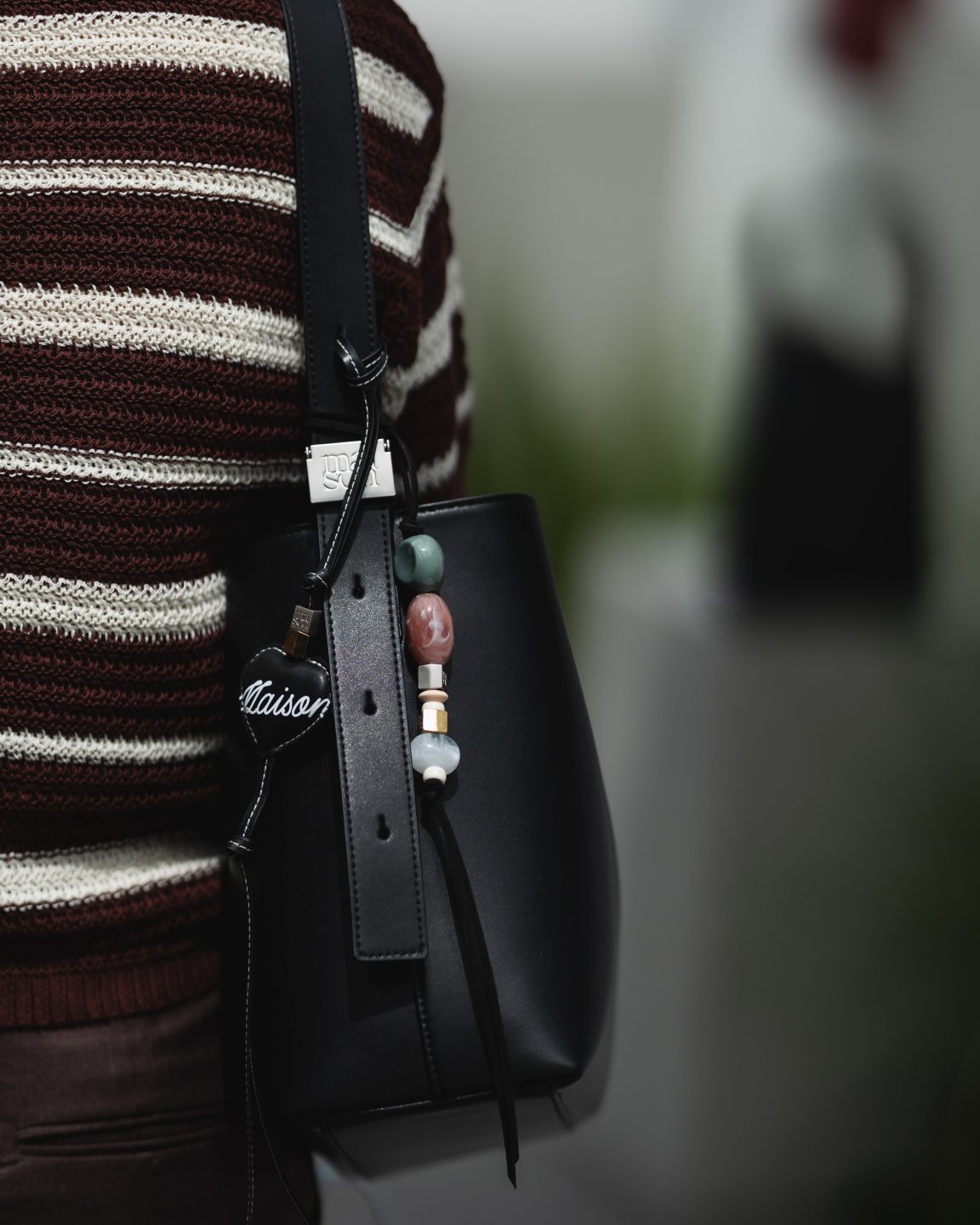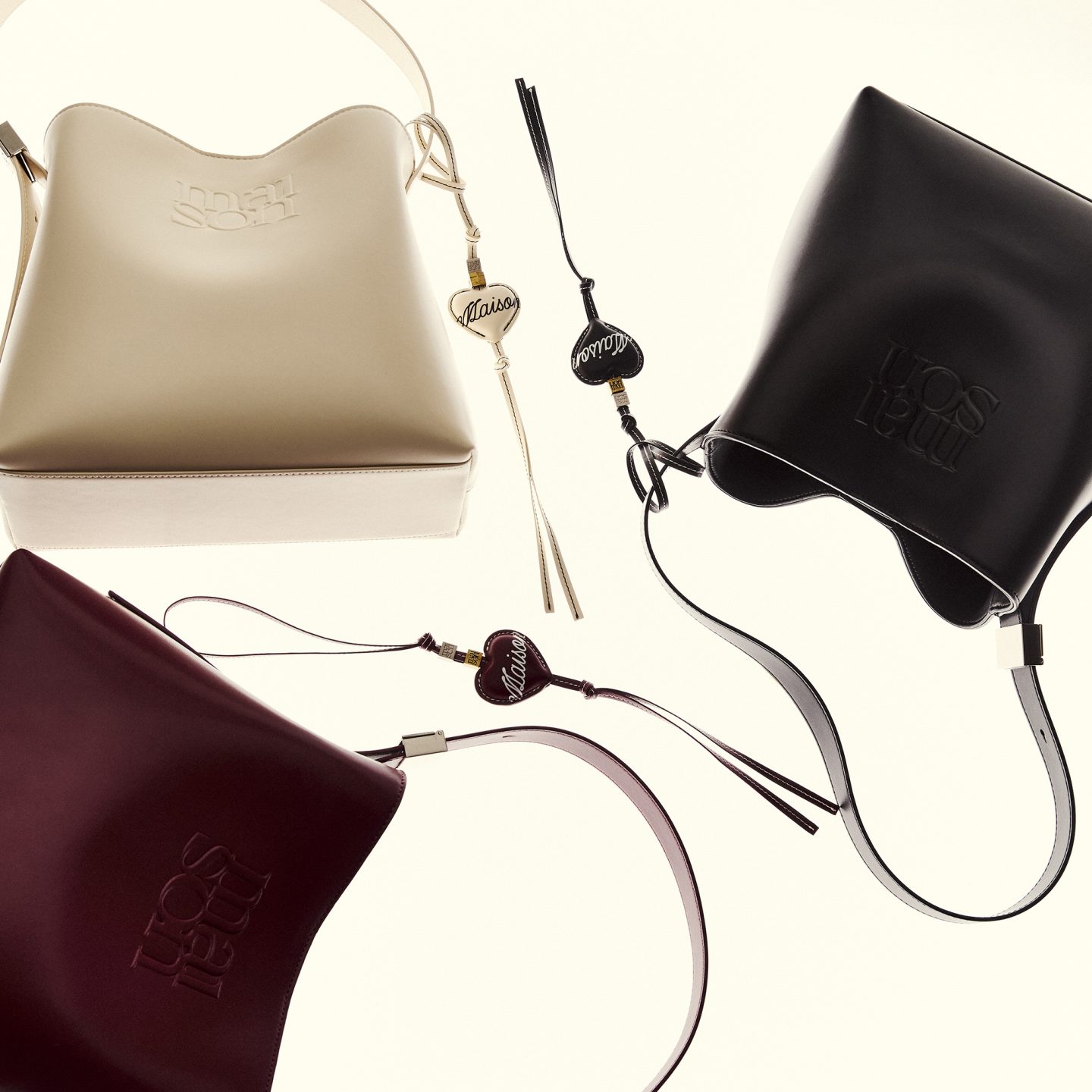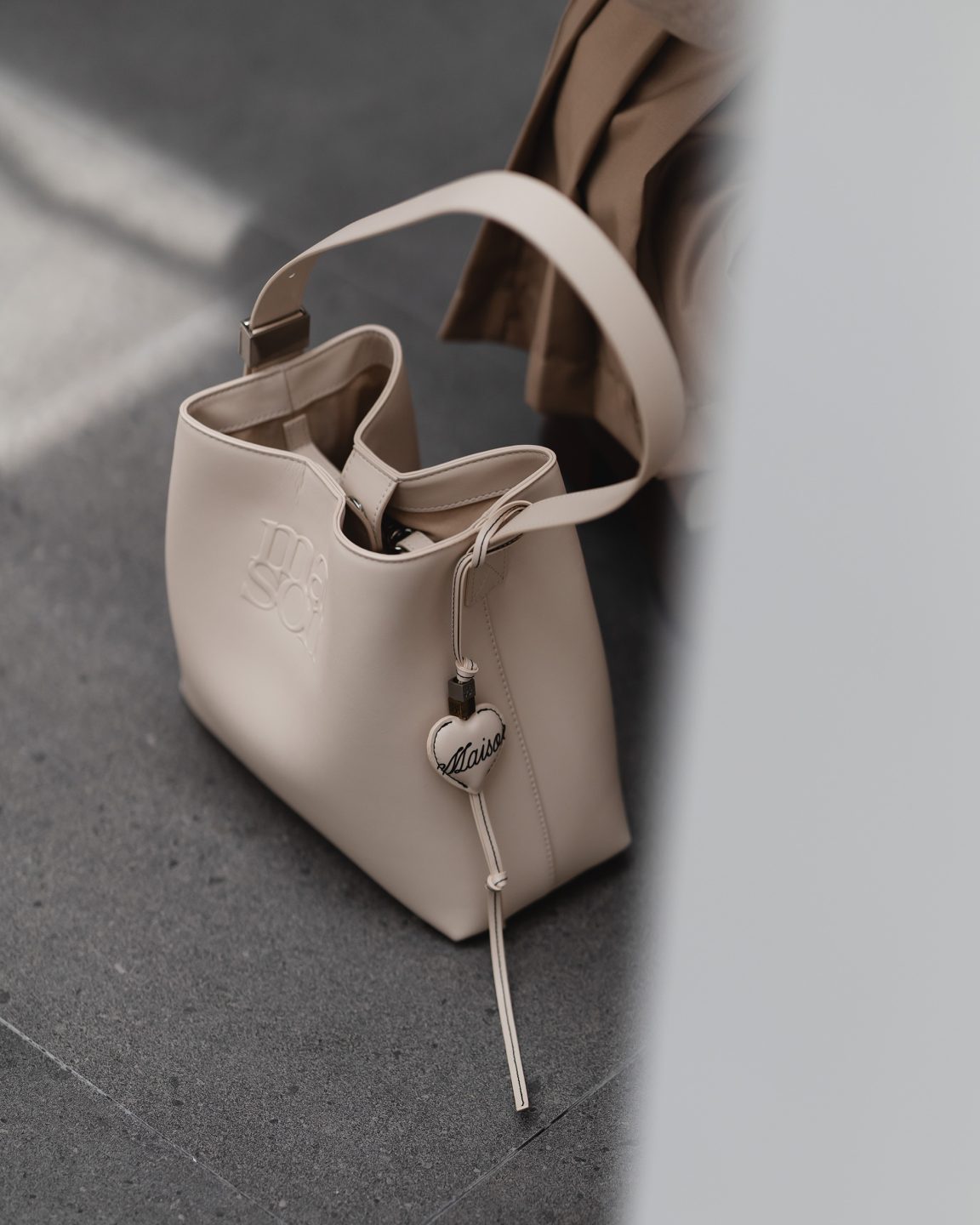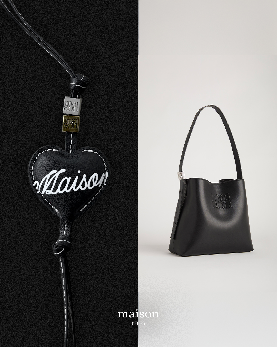 พวงกุญแจรูปหัวใจ ที่ตั้งใจจับคู่สีสกรีนโลโก้ลายเส้นตัวเขียน maison มาให้อย่างลงตัว ผลิตจาก Premium Vegan Leather น้ำหนักเบาและสัมผัสนุ่มฟูแบบ Puffy เพิ่มกิมมิคด้วยการร้อย Cubic Charm ปั๊มโลโก้ Dual maison อะไหล่สีเงินและสีทองเข้าไปกับตัวพวงกุญแจ นำไปห้อยกับกระเป๋า The Maison Bag บอกเลยว่าเก๋ เข้ากันสุดๆ