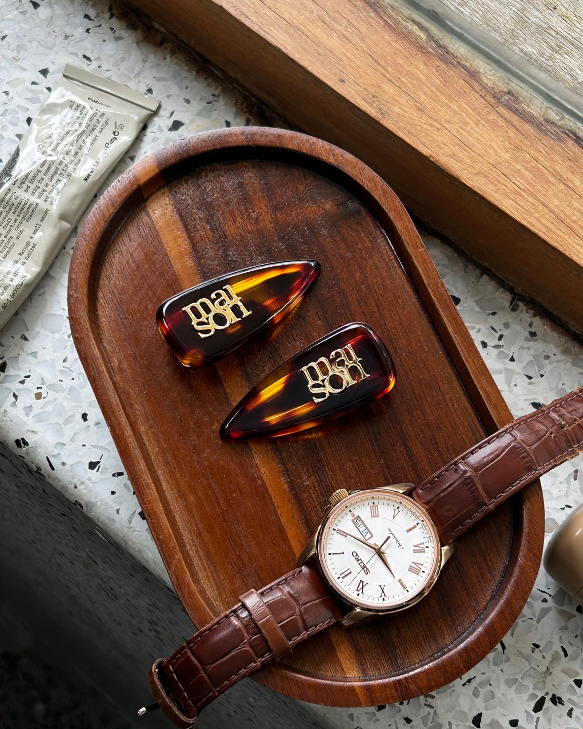 กิ๊บหนีบผมดีไซน์ใหม่ โดดเด่นด้วยโลโก้ Dual maison อะไหล่สีทอง ที่ดูเรียบหรูตัดกันอย่างลงตัวกับกิ๊บลายกระสีน้ำตาล ดีไซน์ออกมาเป็นเซ็ต สำหรับติดทั้ง 2 ฝั่ง เลือกใช้วัสดุ Acetate ซึ่งเป็นวัสดุที่นิยมในแบรนด์แว่นตาและเครื่องประดับระดับไฮเอนด์ ด้วยความเงางามแบบธรรมชาติ ดู Premium แต่น้ำหนักเบา เป็น Hair Accessory ชิ้นเก๋ที่จะติดชิ้นเดียวหรือติดเป็นคู่ 2 ข้างก็น่ารัก ช่วย Complete Look ให้ดูเรียบหรูสุดๆ