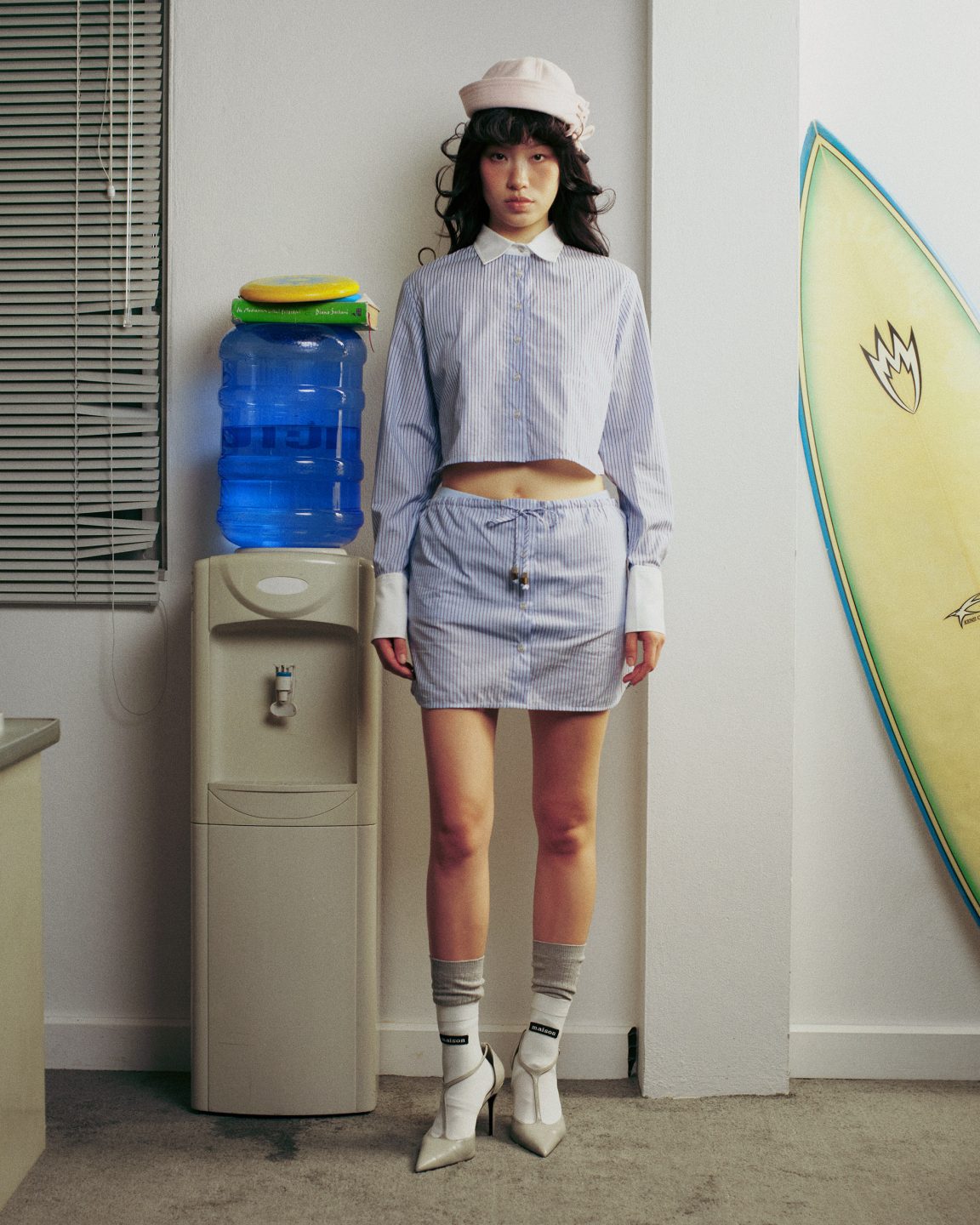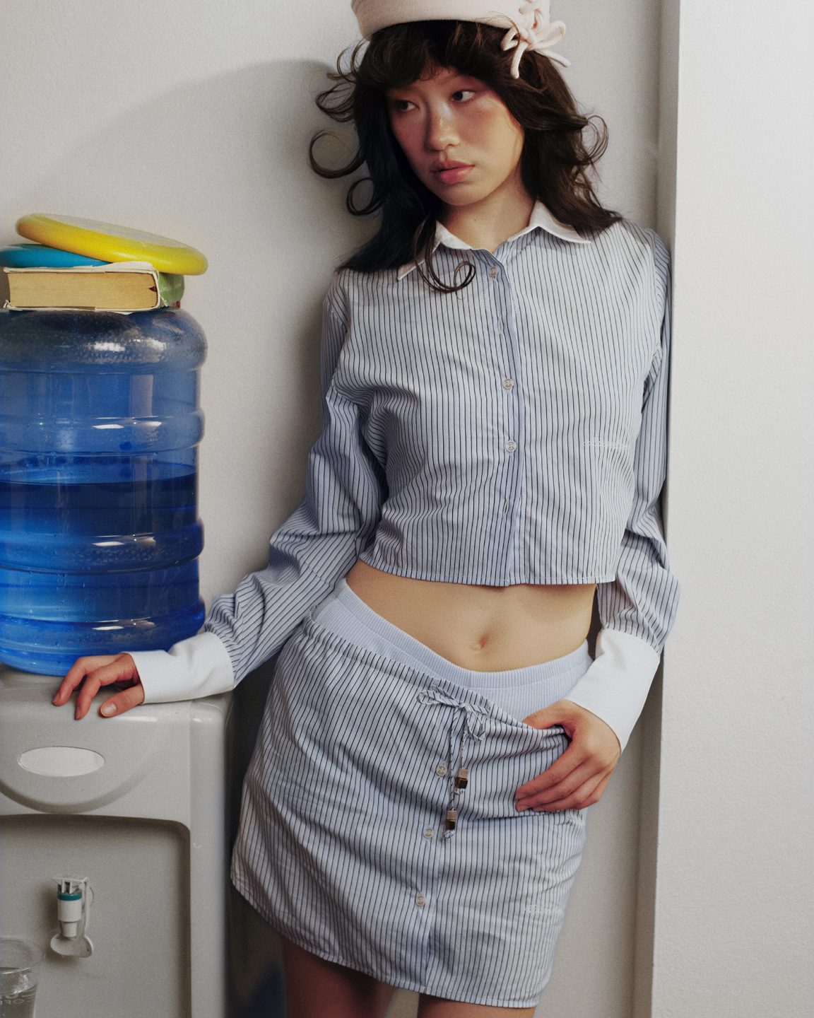 กระโปรงลายทางทรง Mini Skort ดีไซน์ใหม่ที่ทั้งน่ารักและคล่องตัวในตัวเดียว ด้วยดีไซน์ซับในเป็นกางเกงขาสั้นซ่อนด้านใน ช่วยให้สวมใส่ง่าย เคลื่อนไหวได้อย่างมั่นใจ หมดกังวลเรื่องความโป๊ จะใส่เป็นระดับเอวกลางหรือเอวต่ำก็ได้ ดีเทลกระโปรงด้านหน้าตกแต่งด้วยกระดุมโลโก้ maison ขอบเอวออกแบบให้สามารถรูดปรับระดับได้ตามสัดส่วน เพื่อความกระชับพอดีตัว เพิ่มกิมมิคให้เชือกรูดด้วยการร้อย Cubic Charm ปั๊มโลโก้ Dual maison อะไหล่สีเงินและสีทองตรงปลายเชือก ปักด้วยโลโก้ตัวเขียนคำว่า maison KEEPS บริเวณชายกระโปรง เลือกใช้เนื้อผ้า Cotton ลายทาง สีฟ้าสดใส ระบายอากาศได้ดี เหมาะกับอากาศซัมเมอร์สุด ๆ