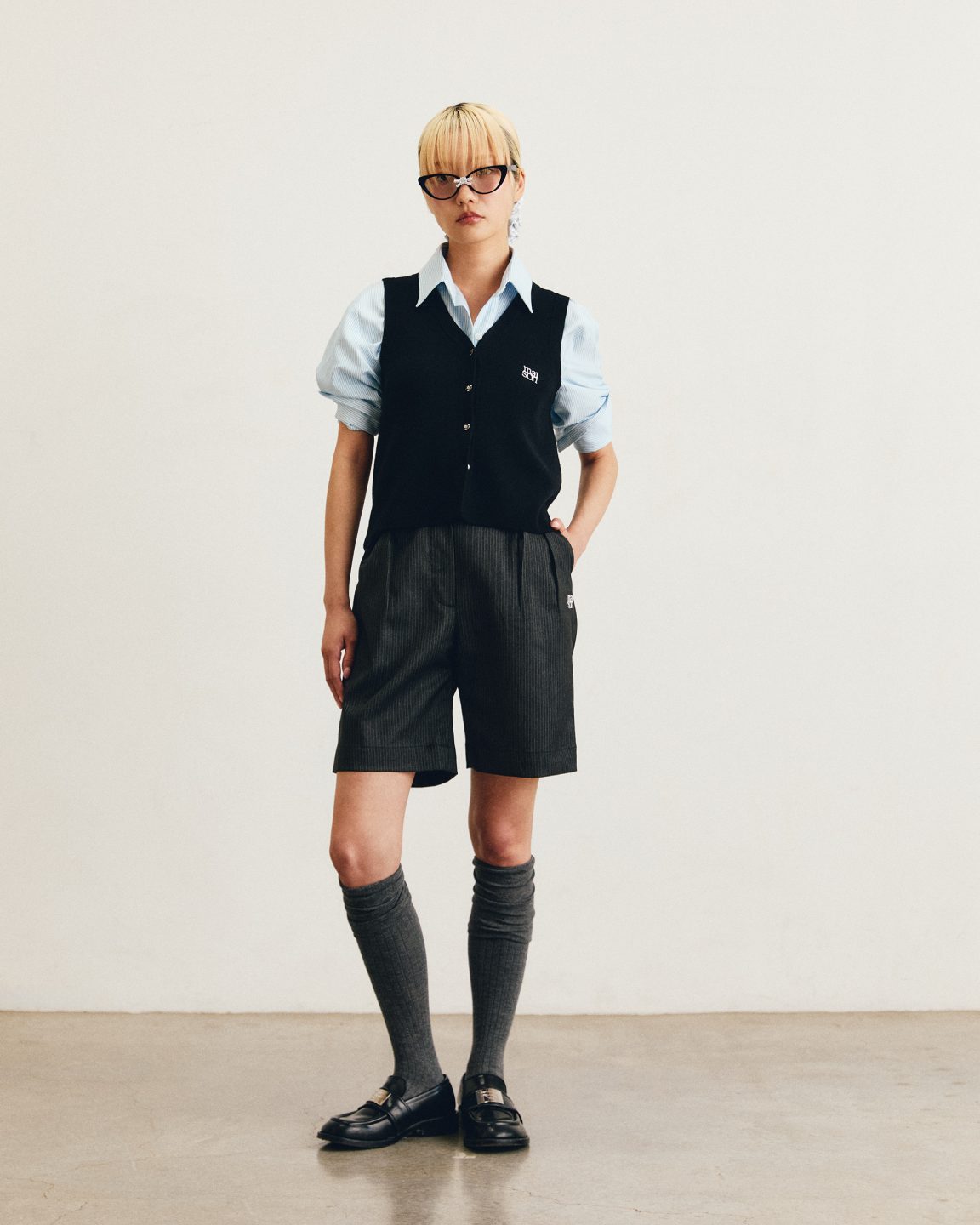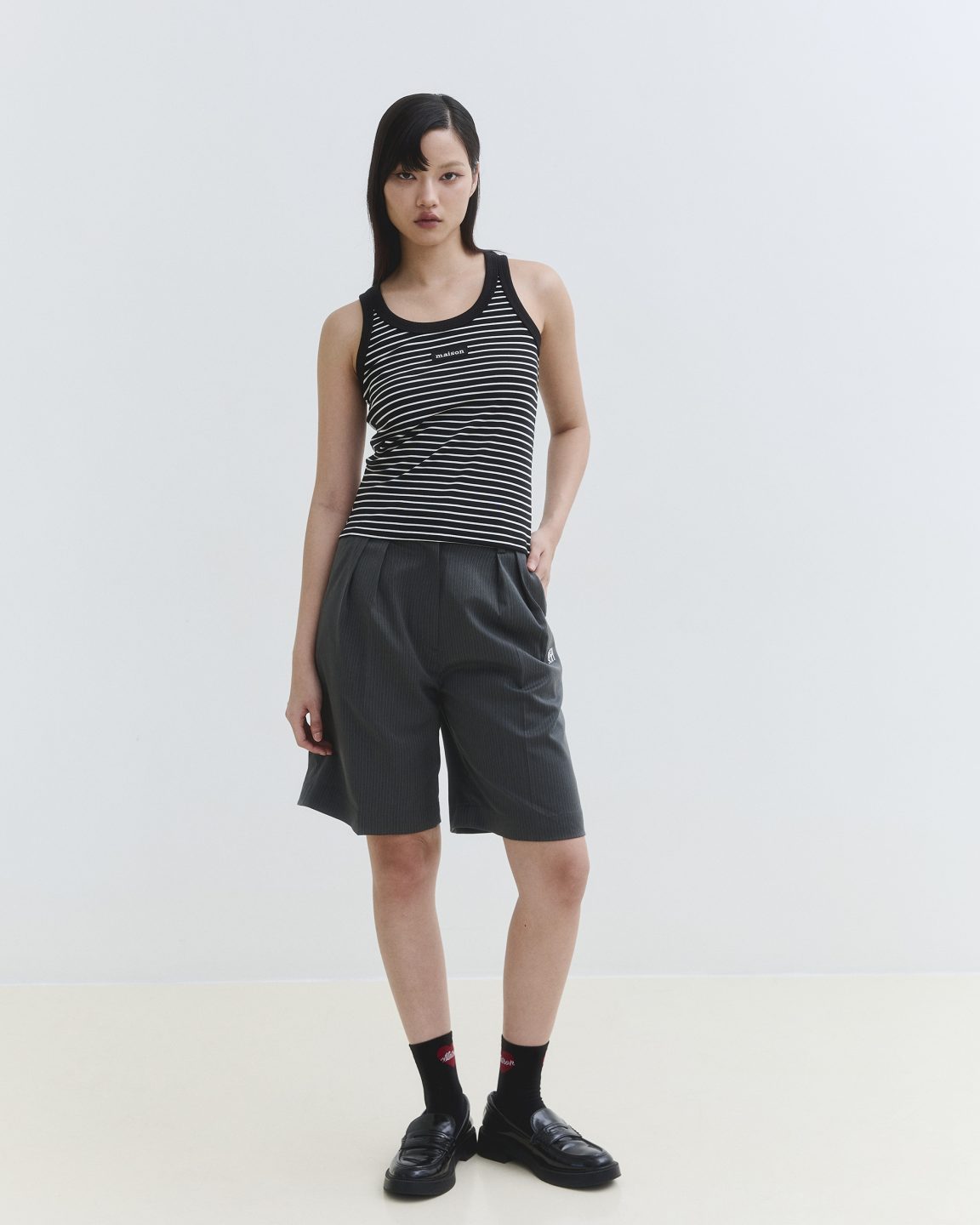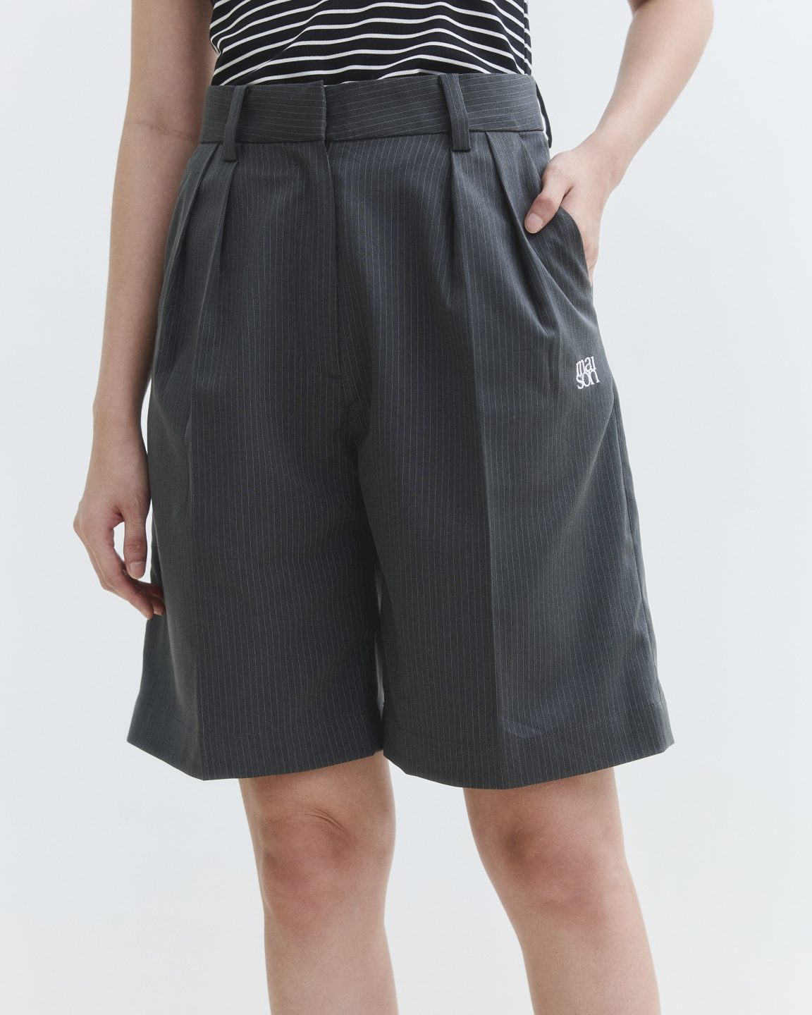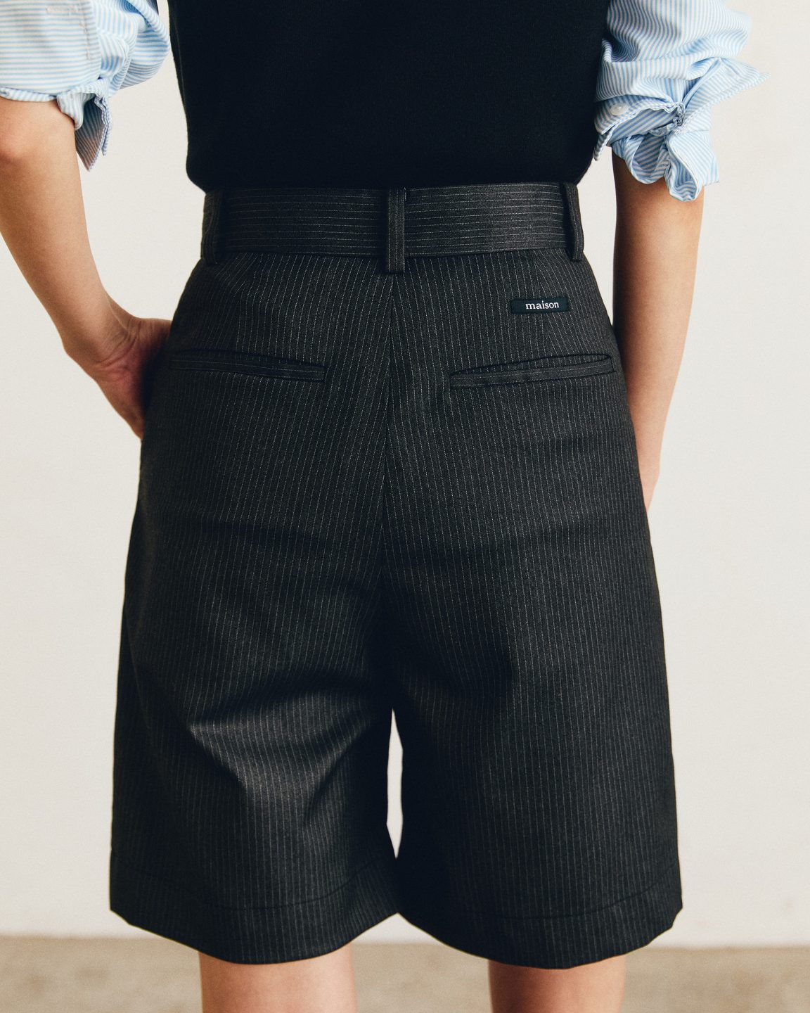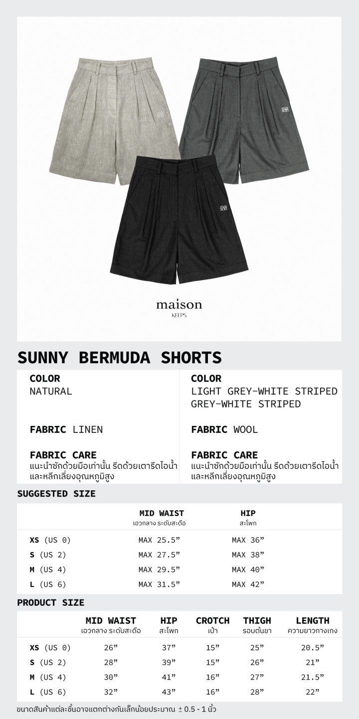 กางเกงขาสั้นทรง Bermuda ที่มีความยาวเหนือเข่าเล็กน้อย ดีเทลด้านหน้าปักโลโก้ dual maison ปลายกระเป๋ากางเกง ด้านหลังติดติดป้าย Label maison ขนาดเล็กเหนือปากกระเป๋าให้เห็นเบาๆเป็นกิมมิค  ผ้า Wool ลายทางเบสิค เนื้อผ้าเบา สบายทำให้การเกงดูมีความ Smart ที่ให้ลุคแบบ Formal และ Casual